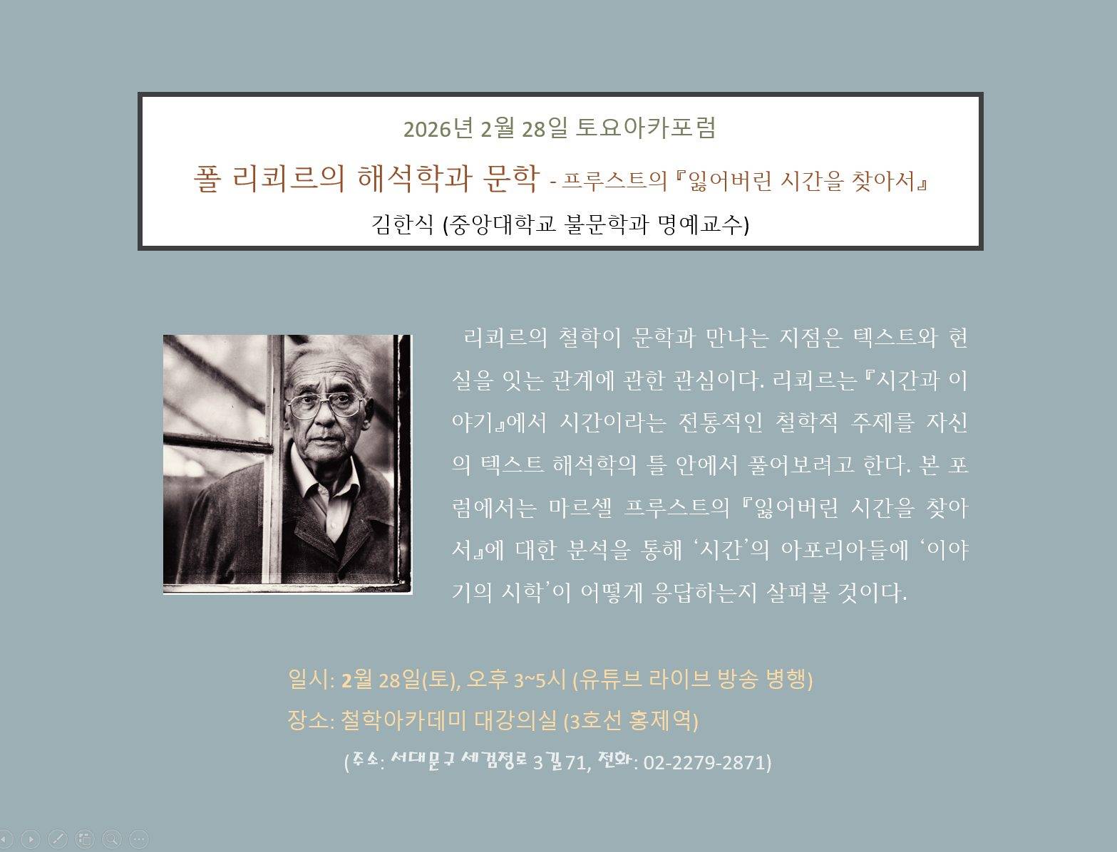 [토요아카포럼] 김한식 선생님 _ 폴 리쾨르의해석학과 문학 - 프루스트의『잃어버린 시간을 찾아서』 (2월 28일, 오후 3~5시) (1)