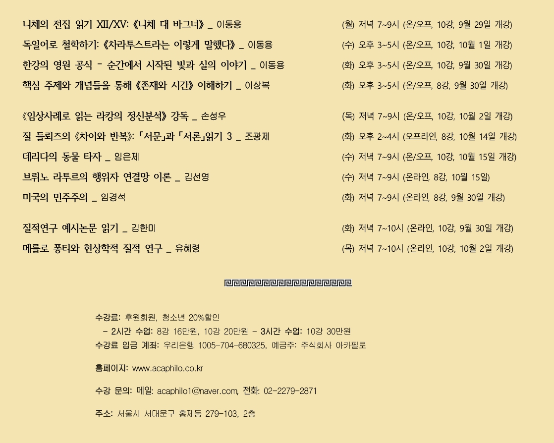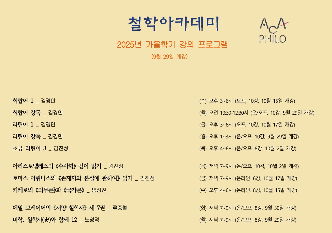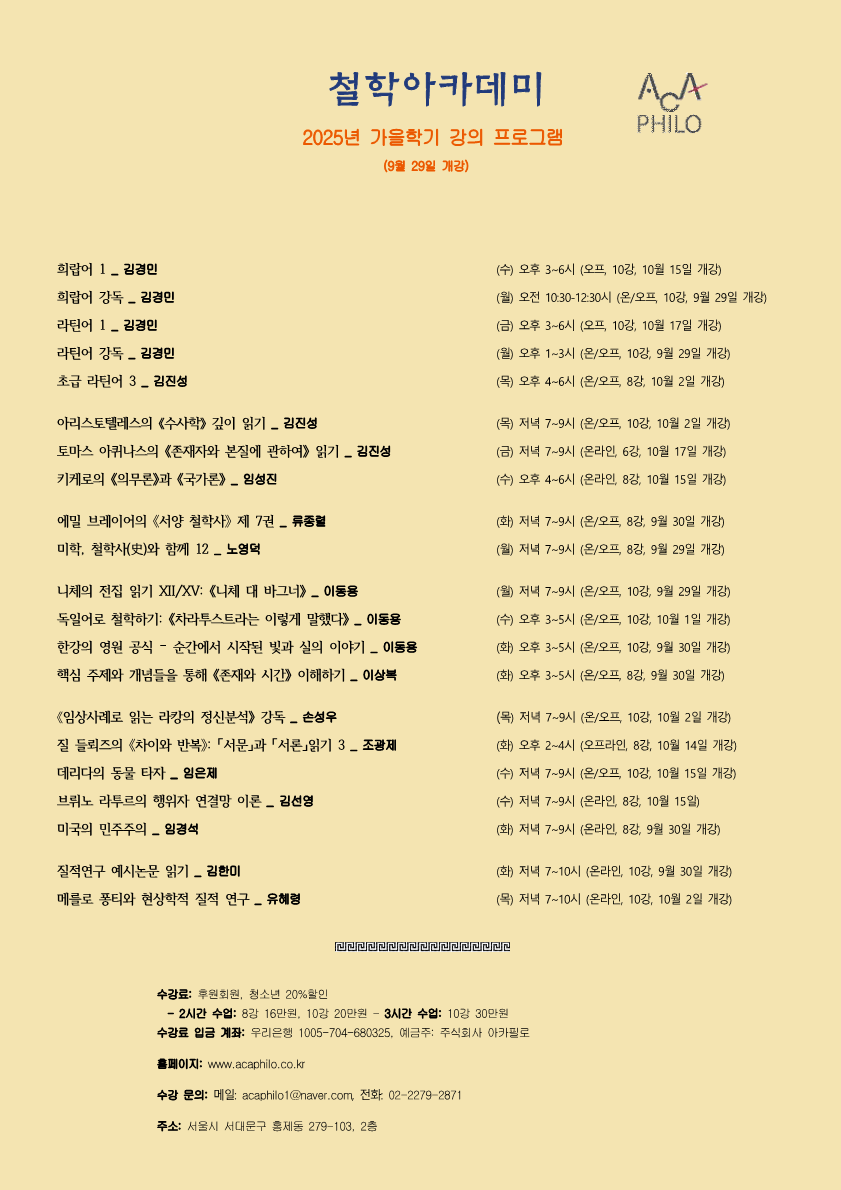 <![CDATA[가을학기를 소개합니다! 개강일 9월 29일(월)]]> 안녕하세요, 철학아카데미 후원회원, 수강생 여러분! 여러분의 꾸준한 관심과 성원에 힘 입어 철학아카데미가 4반세기가 넘도록 시민교육의 선도역할을 하고 있습니다. 진심으로 감사 드립니다. 2025년 가을학기가 다음 주 9월 29일(월)에 시작합니다. 이번 학기에는 열 네 분의 선생님께서 21개의 강좌를 진행하십니다. 서양 고전에 대한 깊은 이해에 필수적인 고전 그리스어와 라틴어에서 시작하여, 아리스토텔레스, 키케로, 토마스 아퀴나스의 저술을 직접 읽는 강의가 있습니다. 니체와 하이데거로 독일철학사상이 소개되고, 연속강좌인 서양 미학사와 서양 철학사가 19~20세기를 중심으로 진행됩니다. 프랑스철학에 관심 있으신 분들은 라캉, 들뢰즈, 데리다에서 최근의 브뤼노 라튀르에 이르는 관련 강의를 추천합니다. 한강 소설에 관한 철학적 접근이 3학기째 이어지고, 미국의 민주주의에 관한 정치철학 강의가 새로 마련되었습니다. 질적 연구에 관한 두 개의 온라인 강좌는 꾸준한 관심과 참여로 계속되고 있습니다. 철학아카데미는 여러분과 소통하며 강의를 마련하고자 합니다. 관심 있는 주제와 원하시는 강사님들을 소개해 주시면 다음 학기에서 잘 반영하여 자리를 마련하도록 하겠습니다. 수강 신청은 메일이나 전화로 하실 수 있습니다.