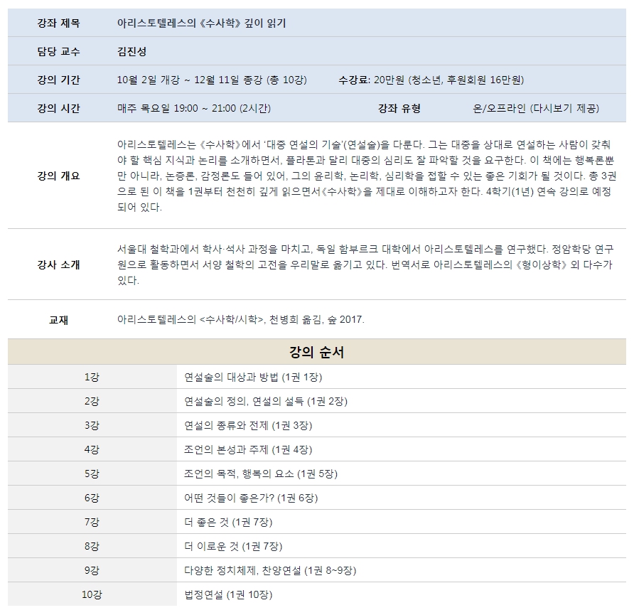 <![CDATA[25가을_김진성(목)_아리스토텔레스의 《수사학》 깊이 읽기 (10월 2일 개강)]]>