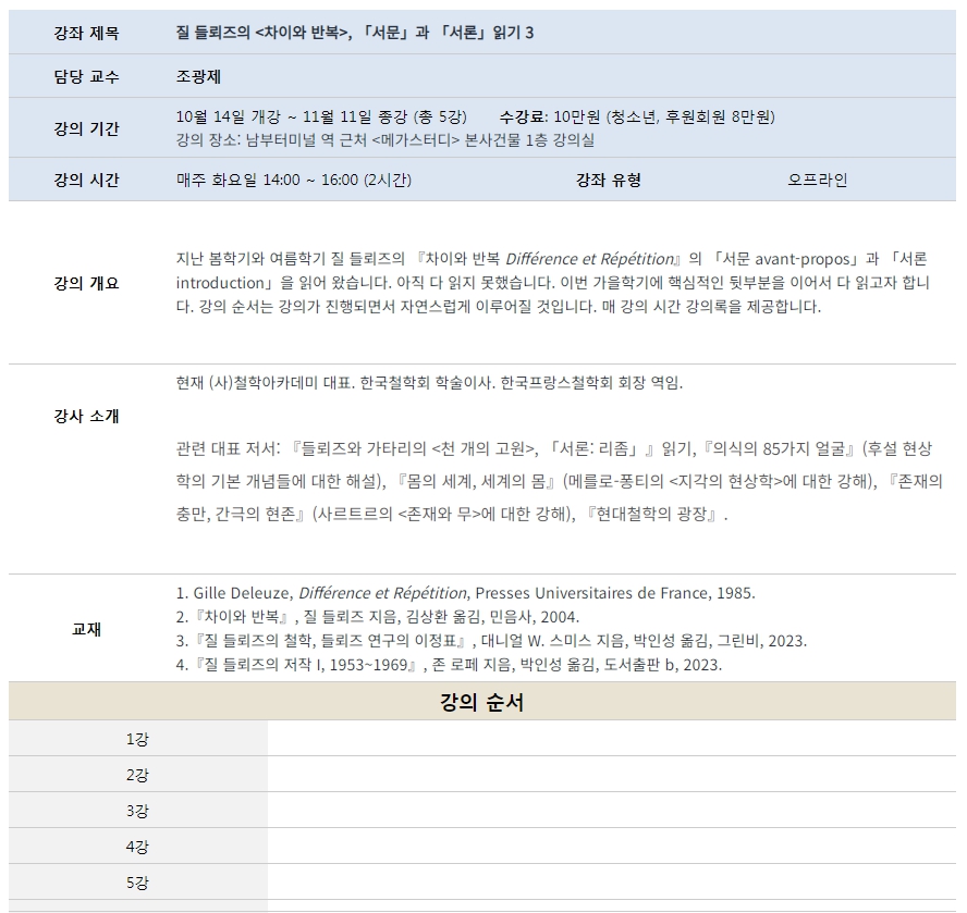 <![CDATA[25가을_조광제(화)_질 들뢰즈의 <차이와 반복>, 「서문」과 「서론」읽기 3 (10월 14일 개강)]]>