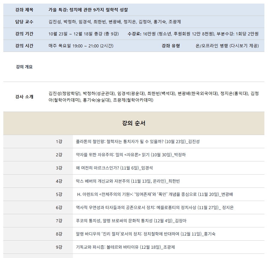 <![CDATA[가을학기 특강 폐강 안내]]> 2025년 가을학기 특강: "정치에 관한 9가지 성찰"은 수강생 미달로 폐강되었음을 알려드립니다. 겨울학기에 더 알차게 구성해서 다시 여러분께 안내해 드리겠습니다. 감사합니다.]]> Tue, 28 Oct 2025 14:01:38 +0000 <![CDATA[오늘 10월 23일 “가을학기 특강: 정치에 관한 9가지 성찰”의 1강은 무료로 진행합니다]]> 오늘 “가을학기 특강: 정치에 관한 9가지 성찰”의 첫 번째 강의는 홍보 기간이 짧아 무료로 진행합니다. 원하시는 분들은 누구든 줌 회의 링크로 접속하셔서 강의를 들으실 수 있습니다. 철학아카데미로 직접 오셔서 들으셔도 좋습니다. 주제는 김진성 선생님의 “플라톤의 철인왕 – 철학자는 통치자가 될 수 있는가?”입니다. 2~9회를 계속해서 들으실 분들은 수강 신청을 해주시면 고맙겠습니다. 주제: 플라톤의 철인왕 - 철학자는 통치자가 될 수 있는가? _ 김진성 (정암학당 연구원) 시간: 10월 23일(목) 저녁 7~9시 줌 링크: